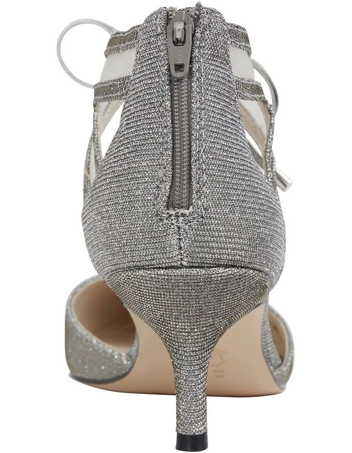 – Approx 4cm heel height – Fabric upper, Synthetic lining & Composite leather sole- Pointed toe design- Triangle shaped cut-out ankle straps with bow detailing