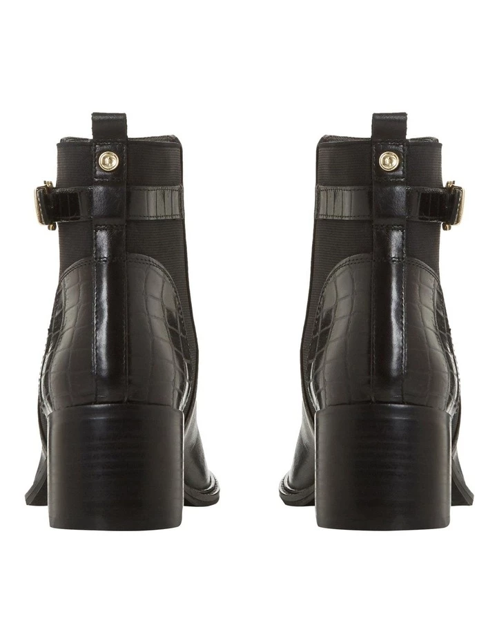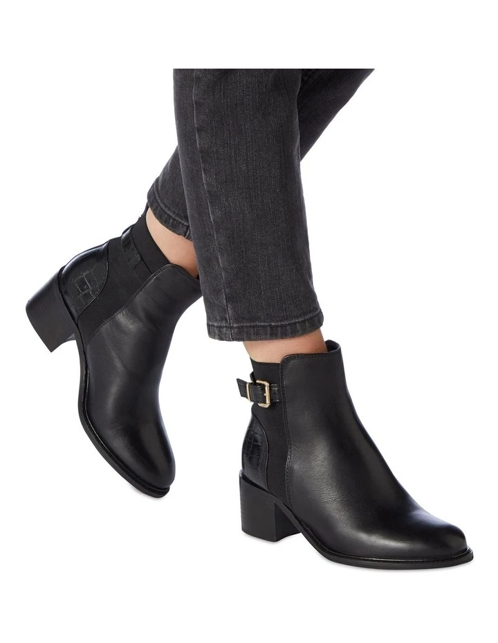 Elevate your smart-casual edit with the Poetic ankle boot from Dune London. An update on the classic Chelsea with a buckle detail and high block heel. Fitted with a round toe it also has elasticated inserts for a comfy fit.
