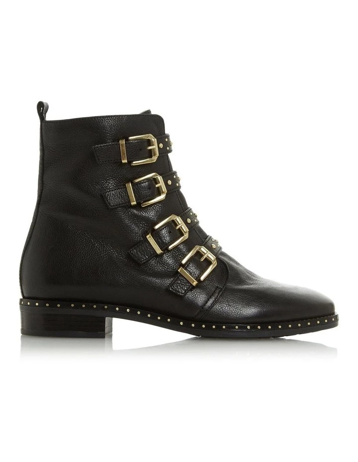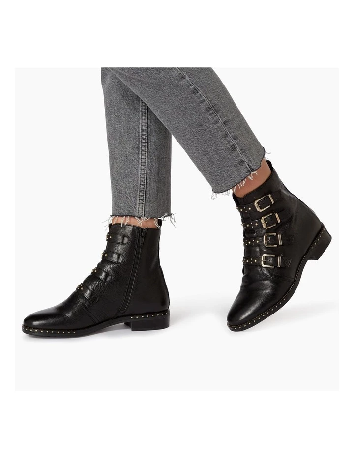 Opt for a tough-luxe edge with the Pixxel biker boot from Dune London. With a low block heel classic round toe and side zip fastening. Stud details and buckle straps complete the design.