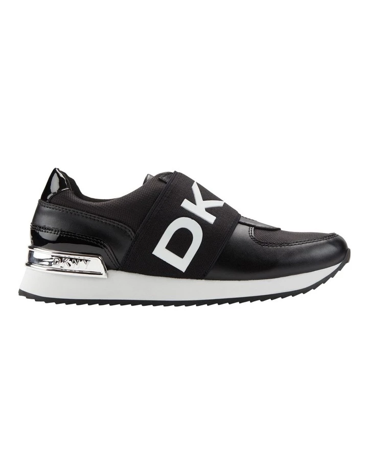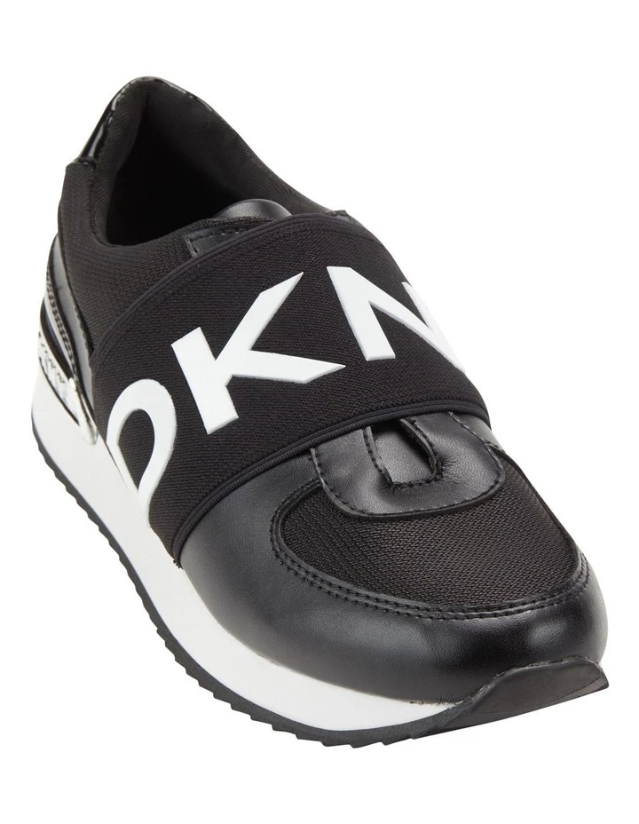 Slip on sneaker with rubberized DKNY logo on elastic strap across vamp, metal plate on counter, round toe, memory foam footbed.