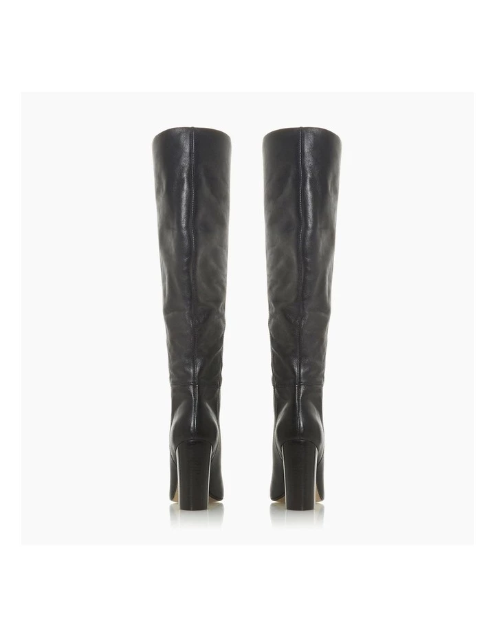Create stylish daytime looks with Dune’s Simonne knee high boot. Fitted with a classic round toe and a handy pull on fit. It’s perched on a contrasting high block heel for added appeal.