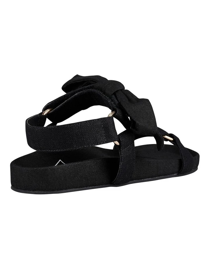 The Calum wedge: a dad sandal, but make it cute. Featuring a deep footbed with black organic linen straps, all wrapped up with a bow on top. Literally.