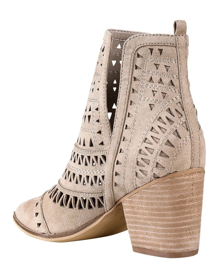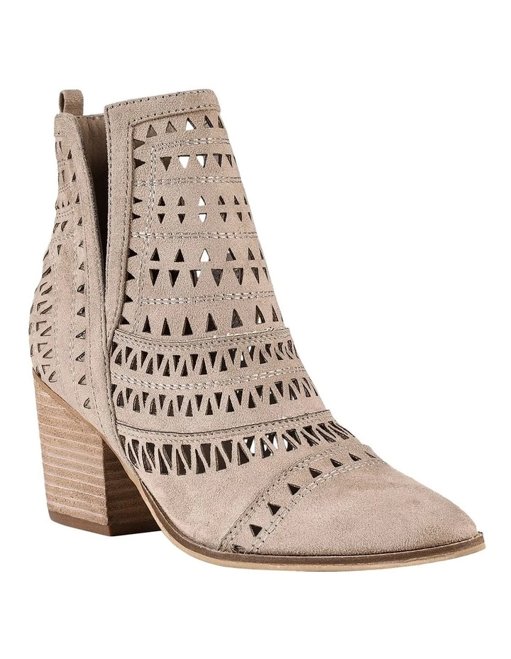 The Karina Boot features cut-out upper, pull-on style with pointed toe and stacked cuban heel. Soft PU Microsuede. Pull-on tab. Must have style this season.