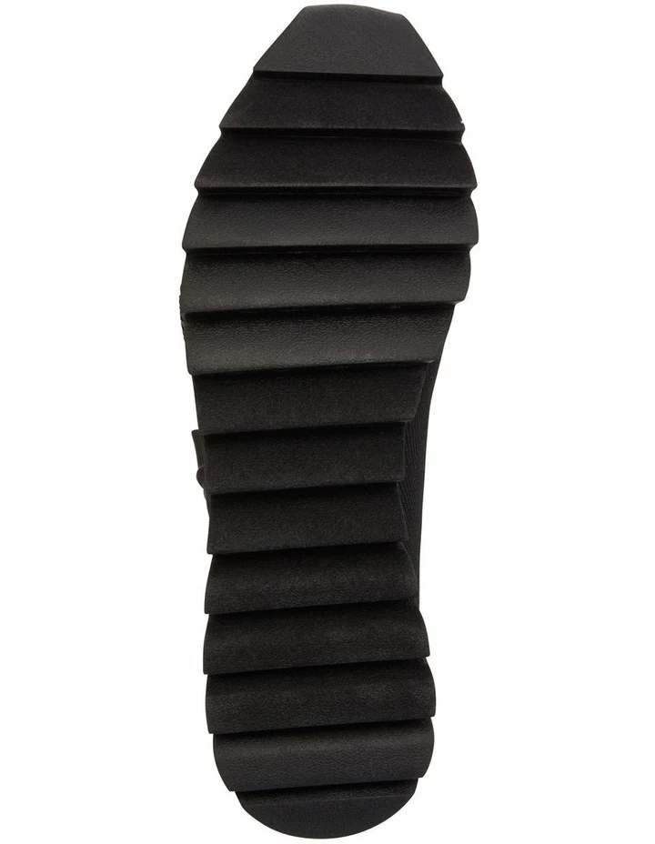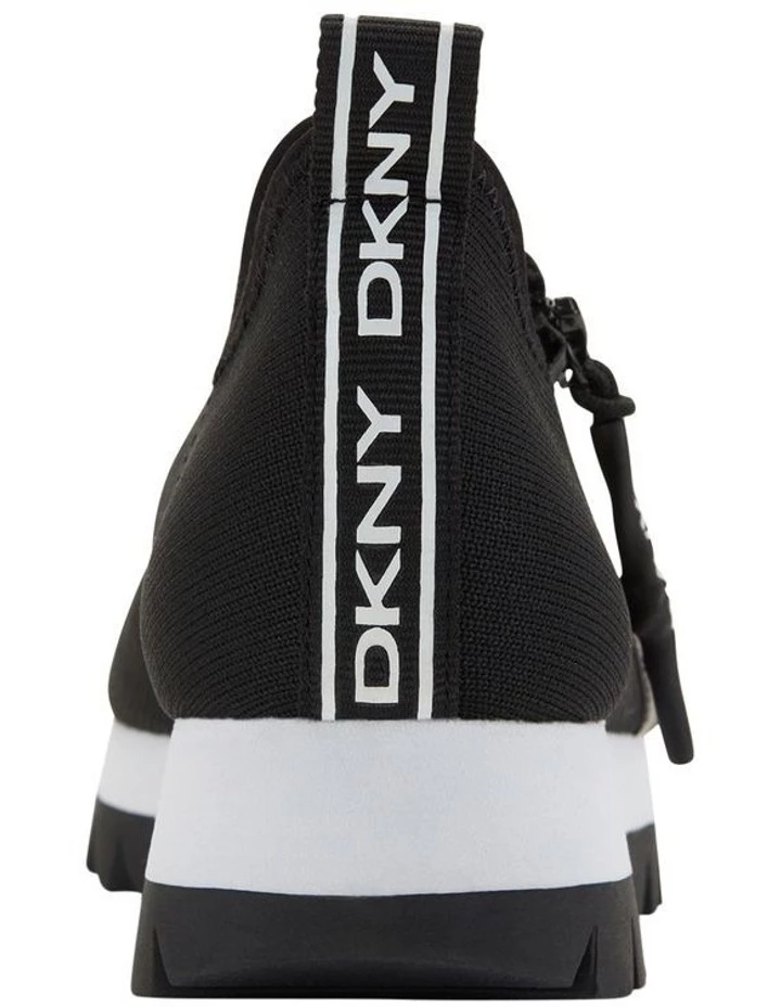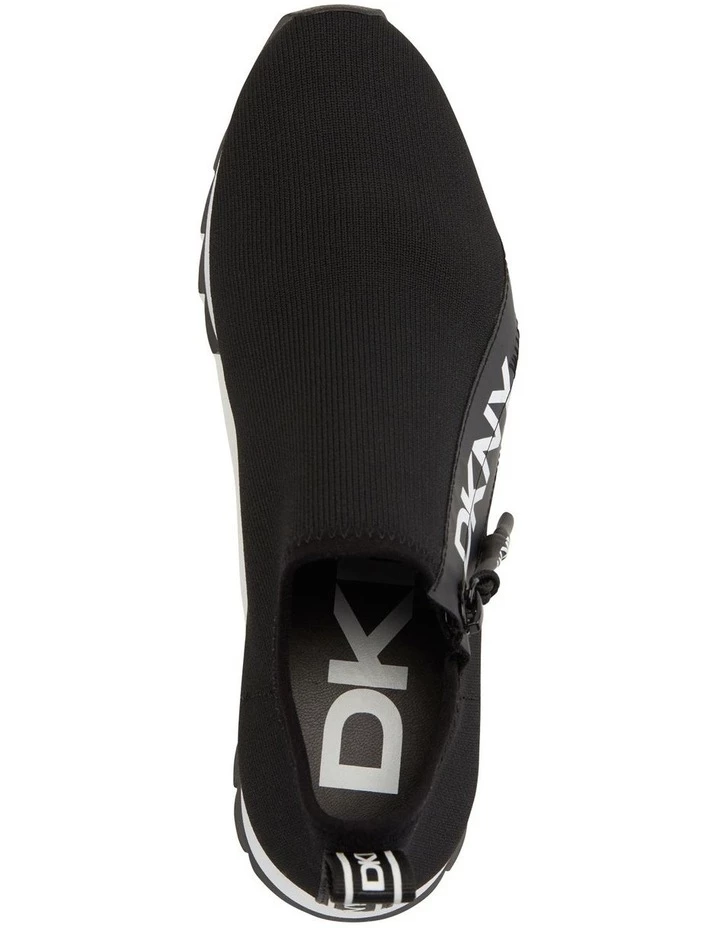 Slip on sneaker with DKNY logo over zipper closure, DKNY logo taping on counter, almond toe shape, sawtooth bottom, memory foam footbed.