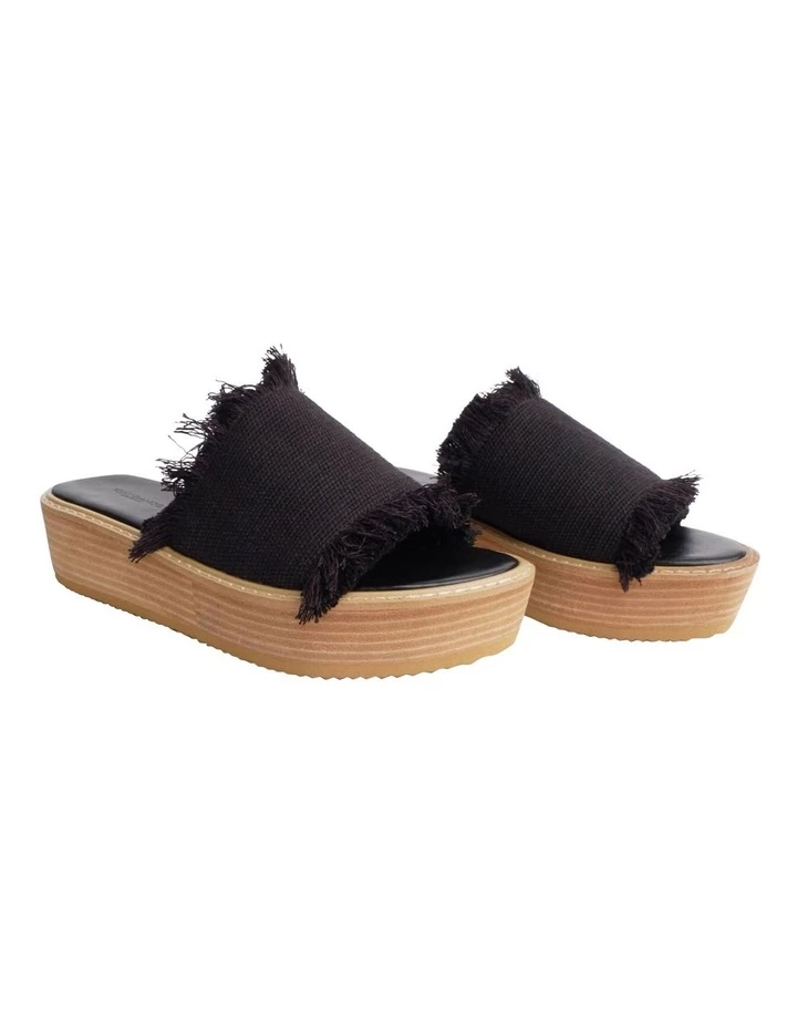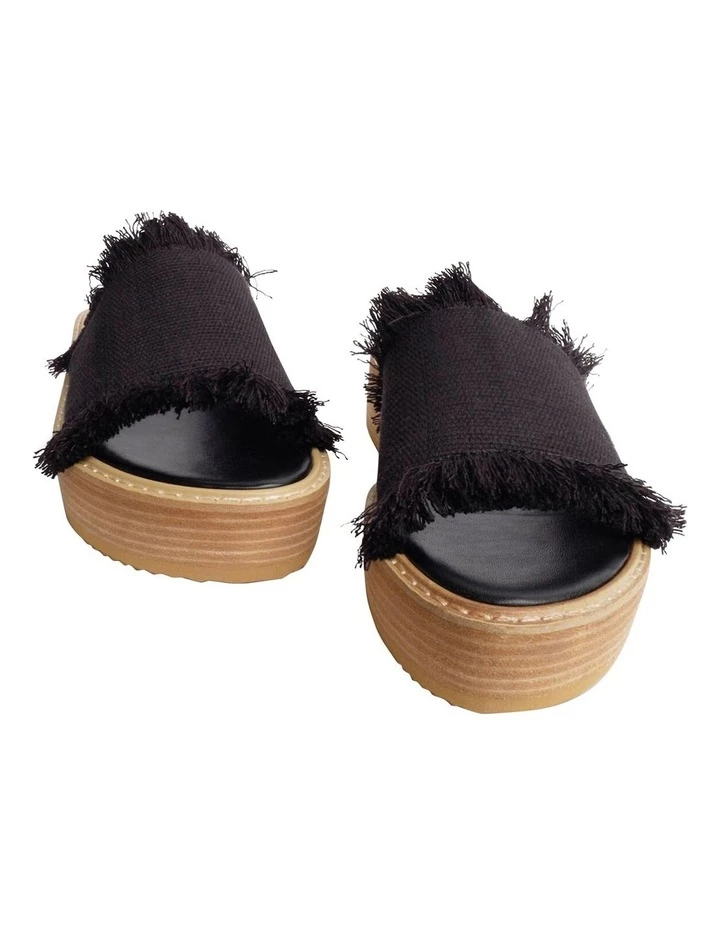 Slip into elevated comfort with the Ebony sandals. Showcasing a textured black cotton fringed upper with an open rounded toe and a platform sole.