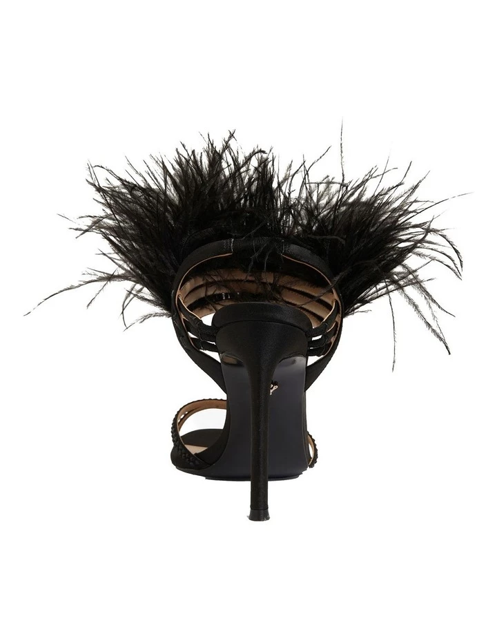 DALVA cites old Hollywood glamour with these theatrical style heel. They feature a lustrous open toe design adorned with crystals to a sling back framed with a halo of feathers, then set on on a stiletto heel .Wear them beneath a satin dress to complete a statement evening look.