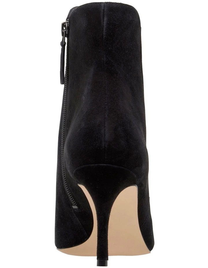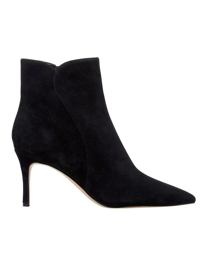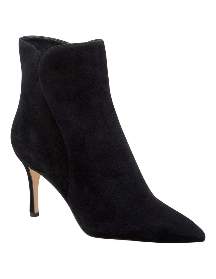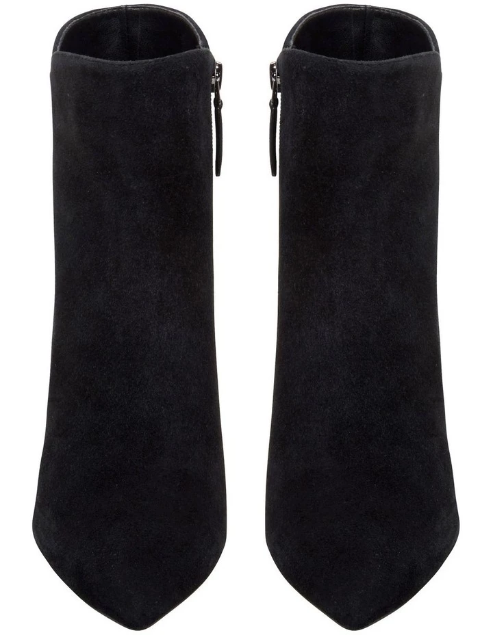 The Messerole Boot is set on a mid-stiletto heel with a pointed toe, unique side paneling and easy zip closure.