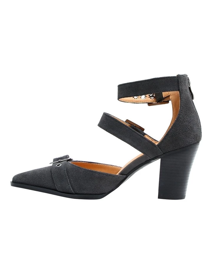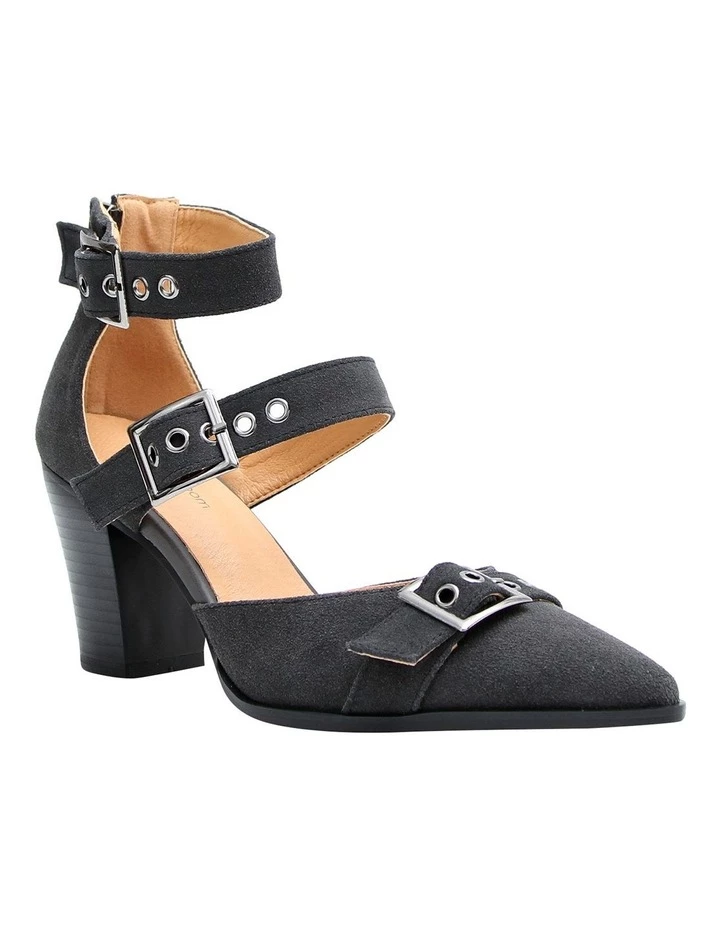 A trio of shiny gunmetal buckles encompassing the foot add an ultramodern edge to the comfortable Pasadena heel. The classic pointed toe and relaxed 8cm block heel make it the perfect shoe to team with outfits for every occasion.