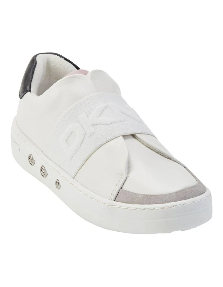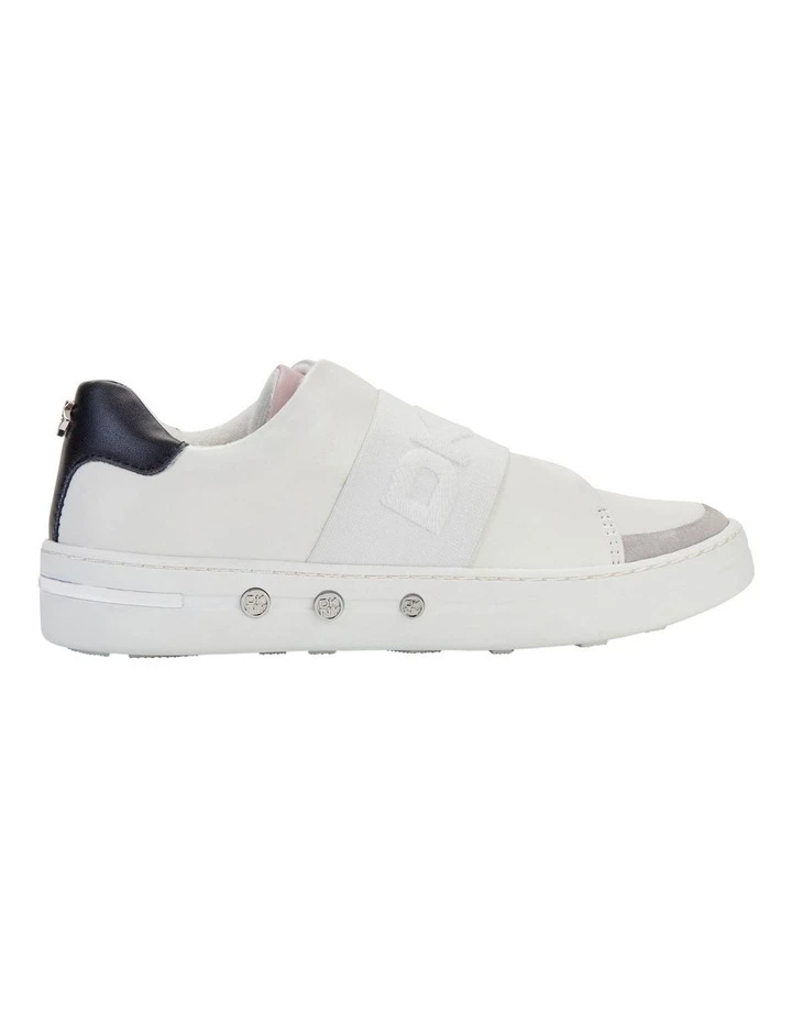 Slip on Sneaker, raised DKNY logo neoprene upper, metal studs in cupsole, elastic goring, round toe, synthetic lining, memory foam footbed