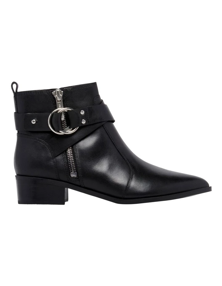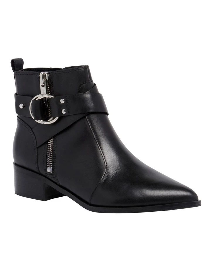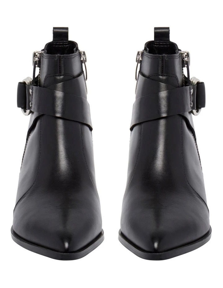 The Collin Boot is the trendy, chic versatile winter staple needed in every shoe-drobe. Defined by it’s sleek lines and sophisticated aesthetic, this classic pointed toe ankle boot features a side zip fastening for easy access and pull on tab at the back of the ankle and a low heel for all day comfort. This ideal everyday boot is complimented by it’s polished silver hardware details and cross over leather straps around the front of the ankle. Pair with a flowy dress and leather jacket or jeans and a chunky sweater.