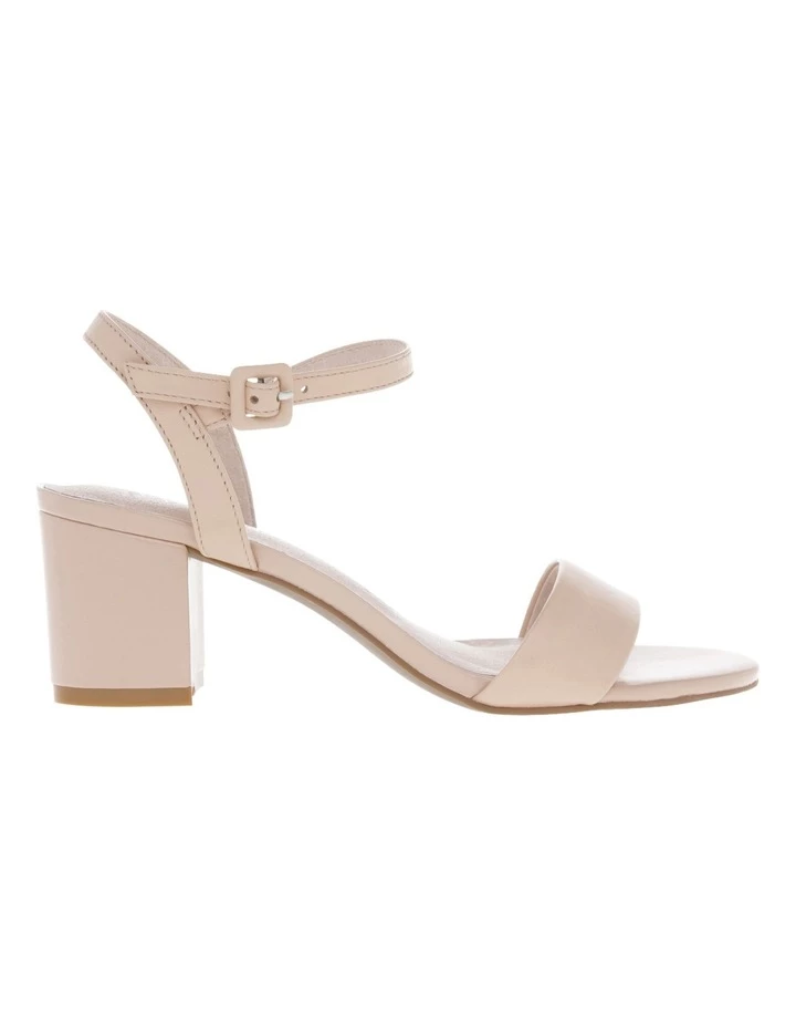 Roma Nude Leather Sandal. Medium block heel sandal with clean, simple lines and covered buckle at ankle. Basque sandals are leather lined and have a flexible rubber outsole. Materials: Leather upper and lining, non-leather outsole. 60mm heel height.