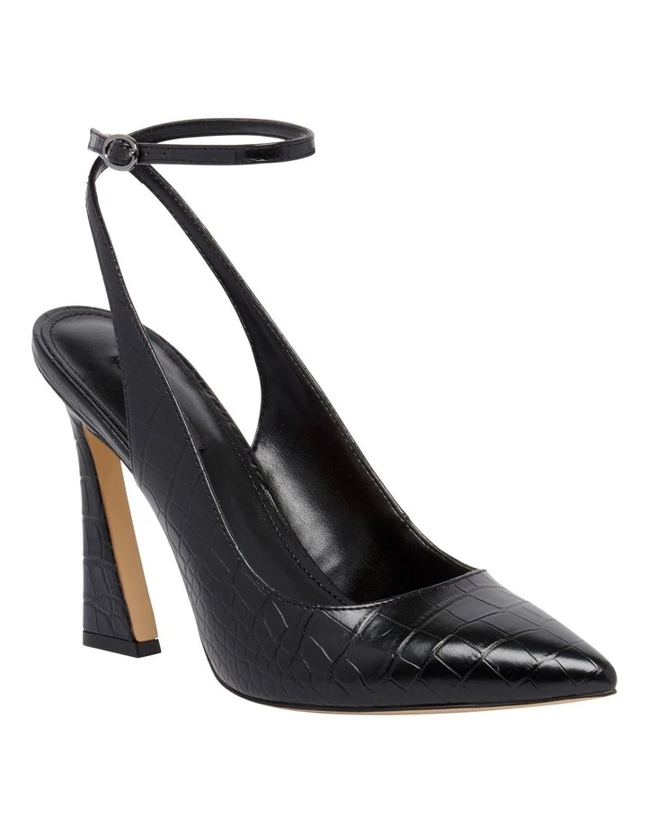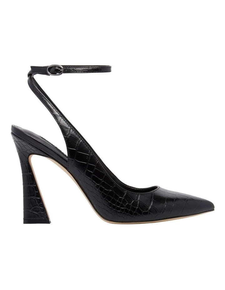 The Tabita Pump is the new business casual favourite. This strappy pump features a classic pointed toe, open back, comfortable footbed and adjustable ankle strap. The unique shaped heel is a chunky alteration to the classic stiletto, inspiring a trend-forward finish to your work and weekend outfits. This stylish pump looks chic peeking out of cuffed pants and tailored denim.