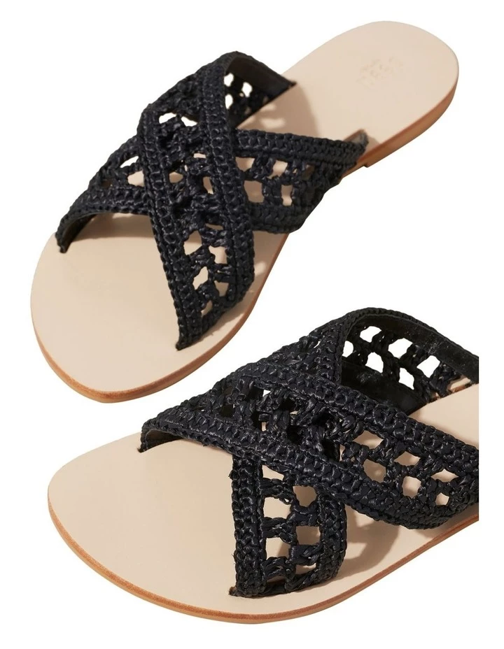 These slip-on sandals feature textured straps made of leather with an intricate cutwork design. The straps cross over at the front, and the sandals feature a flat sole with a 1cm heel.