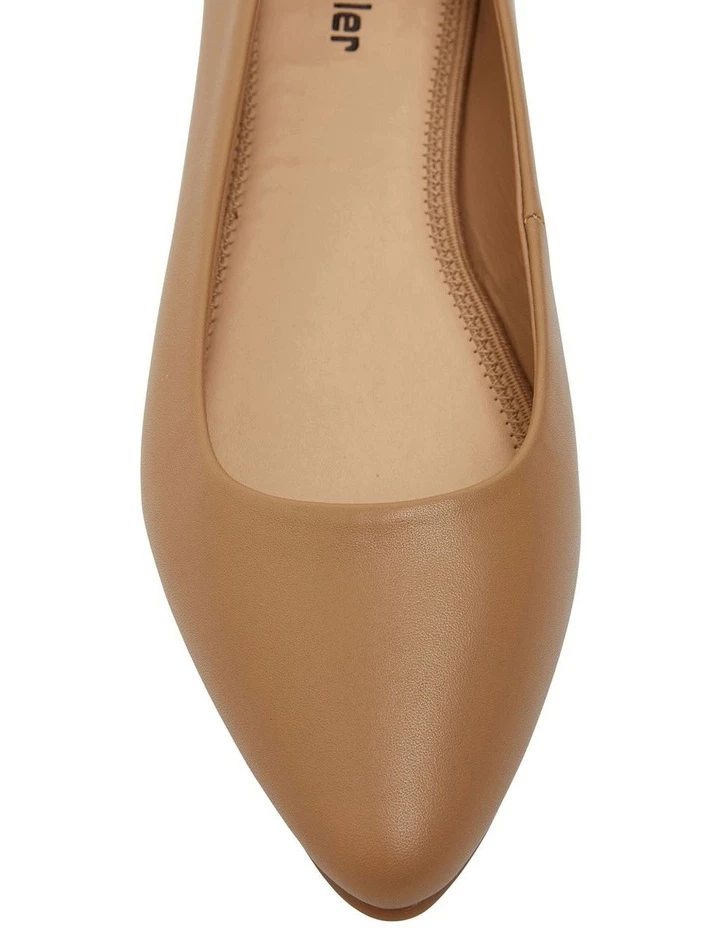 LAURA is a staple for any wardrobe, it offers a subtle lift to the understated ballet flat look. It features a cushioned insole for comfort. Approx. 0.5cm heel height Toe shape: Point Leather upper Synthetic lining Synthetic sole Standard fit (B-fit)