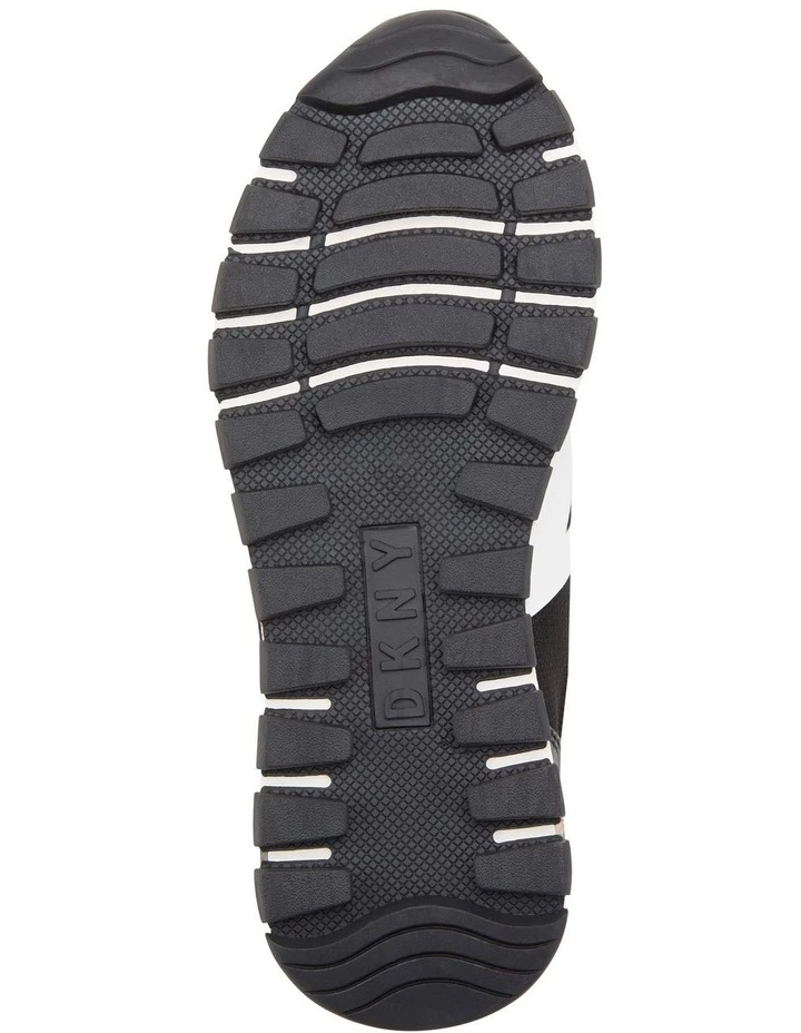 Slip on sneaker with DKNY logo across upper vamp, DKNY logo taping pull tab, metal rand on counter, round toe shape, memory foam footbed